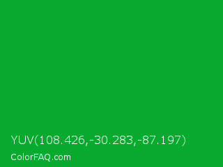 YUV 108.426,-30.283,-87.197 Color is a normal green color and the nearest color is Green Pantone #00ad43. Hex code #09ab2f and RGB value is rgb(9,171,47). In RGB color space, this color is composed of 4% red, 67% green, 18% blue, In CMYK color space, this color is composed of 95% cyan, 0% magenta, 73% yellow , 33% black , In HSL color space, this color has a hue angle of 134° , 90% saturation and 35% lightness.