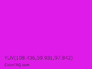 YUV 108.436,59.931,97.842 Color is a normal magenta color and the nearest color is Phlox #df00ff. Hex code #dc1ce6 and RGB value is rgb(220,28,230). In RGB color space, this color is composed of 86% red, 11% green, 90% blue, In CMYK color space, this color is composed of 4% cyan, 88% magenta, 0% yellow , 10% black , In HSL color space, this color has a hue angle of 297° , 80% saturation and 51% lightness.