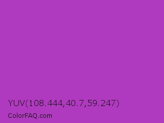 YUV 108.444,40.7,59.247 Color is a normal magenta color and the nearest color is Dark Orchid #9932cc. Hex code #b03abf and RGB value is rgb(176,58,191). In RGB color space, this color is composed of 69% red, 23% green, 75% blue, In CMYK color space, this color is composed of 8% cyan, 70% magenta, 0% yellow , 25% black , In HSL color space, this color has a hue angle of 293° , 53% saturation and 49% lightness.