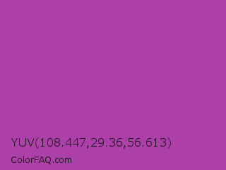 YUV 108.447,29.36,56.613 Color is a normal magenta color and the nearest color is Byzantine #bd33a4. Hex code #ad40a8 and RGB value is rgb(173,64,168). In RGB color space, this color is composed of 68% red, 25% green, 66% blue, In CMYK color space, this color is composed of 0% cyan, 63% magenta, 3% yellow , 32% black , In HSL color space, this color has a hue angle of 303° , 46% saturation and 46% lightness.