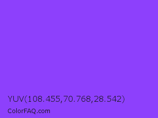 YUV 108.455,70.768,28.542 Color is a light violet color and the nearest color is Navy Purple #9457eb. Hex code #8d40fc and RGB value is rgb(141,64,252). In RGB color space, this color is composed of 55% red, 25% green, 99% blue, In CMYK color space, this color is composed of 44% cyan, 75% magenta, 0% yellow , 1% black , In HSL color space, this color has a hue angle of 265° , 97% saturation and 62% lightness.