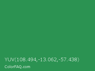 YUV 108.494,-13.062,-57.438 Color is a normal green color and the nearest color is Sea Green #2e8b57. Hex code #2b9352 and RGB value is rgb(43,147,82). In RGB color space, this color is composed of 17% red, 58% green, 32% blue, In CMYK color space, this color is composed of 71% cyan, 0% magenta, 44% yellow , 42% black , In HSL color space, this color has a hue angle of 143° , 55% saturation and 37% lightness.