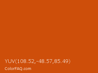 YUV 108.52,-48.57,85.49 Color is a normal orange color and the nearest color is Burnt Orange #cc5500. Hex code #ce4e0a and RGB value is rgb(206,78,10). In RGB color space, this color is composed of 81% red, 31% green, 4% blue, In CMYK color space, this color is composed of 0% cyan, 62% magenta, 95% yellow , 19% black , In HSL color space, this color has a hue angle of 21° , 91% saturation and 42% lightness.