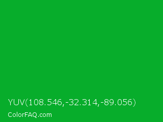 YUV 108.546,-32.314,-89.056 Color is a normal green color and the nearest color is Green Pantone #00ad43. Hex code #07ad2b and RGB value is rgb(7,173,43). In RGB color space, this color is composed of 3% red, 68% green, 17% blue, In CMYK color space, this color is composed of 96% cyan, 0% magenta, 75% yellow , 32% black , In HSL color space, this color has a hue angle of 133° , 92% saturation and 35% lightness.