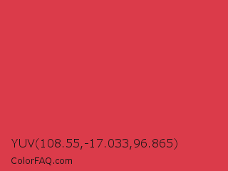 YUV 108.55,-17.033,96.865 Color is a normal red color and the nearest color is Jasper #d73b3e. Hex code #db3b4a and RGB value is rgb(219,59,74). In RGB color space, this color is composed of 86% red, 23% green, 29% blue, In CMYK color space, this color is composed of 0% cyan, 73% magenta, 66% yellow , 14% black , In HSL color space, this color has a hue angle of 354° , 69% saturation and 55% lightness.