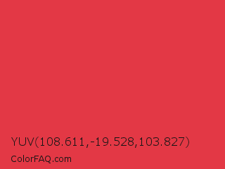 YUV 108.611,-19.528,103.827 Color is a normal red color and the nearest color is Jasper #d73b3e. Hex code #e33845 and RGB value is rgb(227,56,69). In RGB color space, this color is composed of 89% red, 22% green, 27% blue, In CMYK color space, this color is composed of 0% cyan, 75% magenta, 70% yellow , 11% black , In HSL color space, this color has a hue angle of 355° , 75% saturation and 55% lightness.
