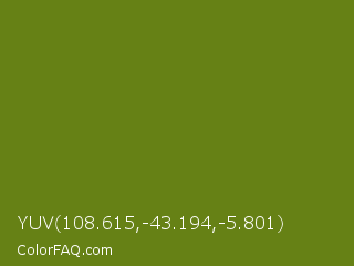 YUV 108.615,-43.194,-5.801 Color is a dark lime color and the nearest color is Fern Frond #657220. Hex code #668115 and RGB value is rgb(102,129,21). In RGB color space, this color is composed of 40% red, 51% green, 8% blue, In CMYK color space, this color is composed of 21% cyan, 0% magenta, 84% yellow , 49% black , In HSL color space, this color has a hue angle of 75° , 72% saturation and 29% lightness.