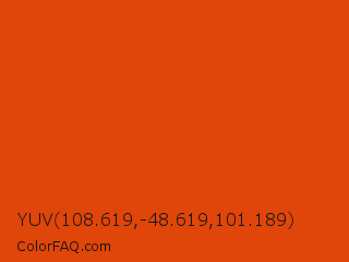 YUV 108.619,-48.619,101.189 Color is a normal orange color and the nearest color is Trinidad #e64e03. Hex code #e0450a and RGB value is rgb(224,69,10). In RGB color space, this color is composed of 88% red, 27% green, 4% blue, In CMYK color space, this color is composed of 0% cyan, 69% magenta, 96% yellow , 12% black , In HSL color space, this color has a hue angle of 17° , 91% saturation and 46% lightness.