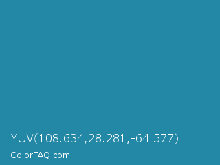 YUV 108.634,28.281,-64.577 Color is a normal blue color and the nearest color is Jelly Bean #297b9a. Hex code #2387a6 and RGB value is rgb(35,135,166). In RGB color space, this color is composed of 14% red, 53% green, 65% blue, In CMYK color space, this color is composed of 79% cyan, 19% magenta, 0% yellow , 35% black , In HSL color space, this color has a hue angle of 194° , 65% saturation and 39% lightness.