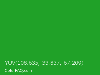 YUV 108.635,-33.837,-67.209 Color is a normal green color and the nearest color is Slimy Green #299617. Hex code #20a128 and RGB value is rgb(32,161,40). In RGB color space, this color is composed of 13% red, 63% green, 16% blue, In CMYK color space, this color is composed of 80% cyan, 0% magenta, 75% yellow , 37% black , In HSL color space, this color has a hue angle of 124° , 67% saturation and 38% lightness.
