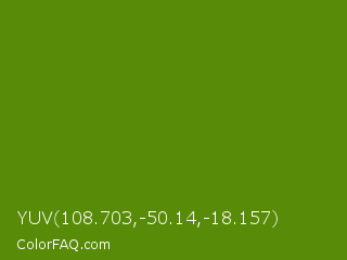 YUV 108.703,-50.14,-18.157 Color is a dark green color and the nearest color is Avocado #568203. Hex code #588b07 and RGB value is rgb(88,139,7). In RGB color space, this color is composed of 35% red, 55% green, 3% blue, In CMYK color space, this color is composed of 37% cyan, 0% magenta, 95% yellow , 45% black , In HSL color space, this color has a hue angle of 83° , 90% saturation and 29% lightness.