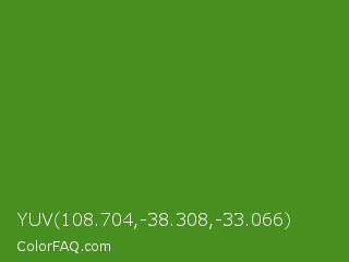 YUV 108.704,-38.308,-33.066 Color is a normal green color and the nearest color is Vida Loca #549019. Hex code #478f1f and RGB value is rgb(71,143,31). In RGB color space, this color is composed of 28% red, 56% green, 12% blue, In CMYK color space, this color is composed of 50% cyan, 0% magenta, 78% yellow , 44% black , In HSL color space, this color has a hue angle of 99° , 64% saturation and 34% lightness.