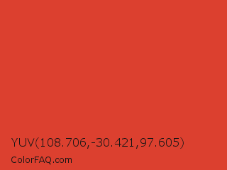 YUV 108.706,-30.421,97.605 Color is a normal red color and the nearest color is Punch #dc4333. Hex code #dc402f and RGB value is rgb(220,64,47). In RGB color space, this color is composed of 86% red, 25% green, 18% blue, In CMYK color space, this color is composed of 0% cyan, 71% magenta, 79% yellow , 14% black , In HSL color space, this color has a hue angle of 6° , 71% saturation and 52% lightness.