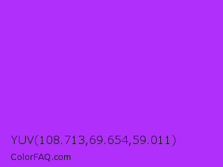 YUV 108.713,69.654,59.011 Color is a normal purple color and the nearest color is Veronica #a020f0. Hex code #b02ffa and RGB value is rgb(176,47,250). In RGB color space, this color is composed of 69% red, 18% green, 98% blue, In CMYK color space, this color is composed of 30% cyan, 81% magenta, 0% yellow , 2% black , In HSL color space, this color has a hue angle of 278° , 95% saturation and 58% lightness.