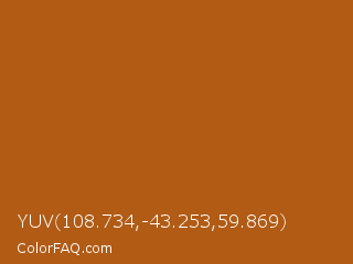 YUV 108.734,-43.253,59.869 Color is a normal orange color and the nearest color is Fiery Orange #b35213. Hex code #b15b15 and RGB value is rgb(177,91,21). In RGB color space, this color is composed of 69% red, 36% green, 8% blue, In CMYK color space, this color is composed of 0% cyan, 49% magenta, 88% yellow , 31% black , In HSL color space, this color has a hue angle of 27° , 79% saturation and 39% lightness.