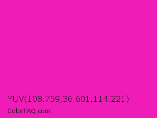 YUV 108.759,36.601,114.221 Color is a normal magenta color and the nearest color is Shocking Pink #fc0fc0. Hex code #ef1cb7 and RGB value is rgb(239,28,183). In RGB color space, this color is composed of 94% red, 11% green, 72% blue, In CMYK color space, this color is composed of 0% cyan, 88% magenta, 23% yellow , 6% black , In HSL color space, this color has a hue angle of 316° , 87% saturation and 52% lightness.