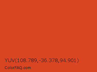 YUV 108.789,-36.378,94.901 Color is a normal red color and the nearest color is Vermilion #d9381e. Hex code #d94423 and RGB value is rgb(217,68,35). In RGB color space, this color is composed of 85% red, 27% green, 14% blue, In CMYK color space, this color is composed of 0% cyan, 69% magenta, 84% yellow , 15% black , In HSL color space, this color has a hue angle of 11° , 72% saturation and 49% lightness.