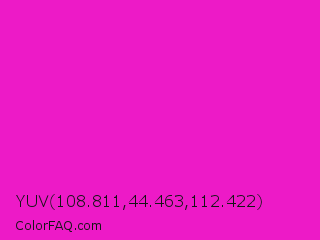 YUV 108.811,44.463,112.422 Color is a normal magenta color and the nearest color is Hot Magenta #ff1dce. Hex code #ed1ac7 and RGB value is rgb(237,26,199). In RGB color space, this color is composed of 93% red, 10% green, 78% blue, In CMYK color space, this color is composed of 0% cyan, 89% magenta, 16% yellow , 7% black , In HSL color space, this color has a hue angle of 311° , 85% saturation and 52% lightness.