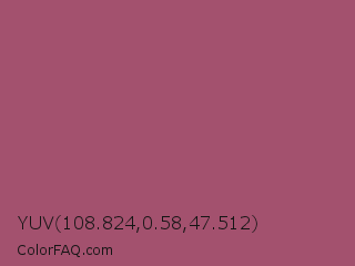 YUV 108.824,0.58,47.512 Color is a normal rose color and the nearest color is China Rose #a8516e. Hex code #a3516e and RGB value is rgb(163,81,110). In RGB color space, this color is composed of 64% red, 32% green, 43% blue, In CMYK color space, this color is composed of 0% cyan, 50% magenta, 33% yellow , 36% black , In HSL color space, this color has a hue angle of 339° , 34% saturation and 48% lightness.