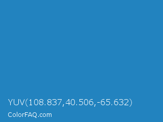 YUV 108.837,40.506,-65.632 Color is a normal blue color and the nearest color is Cyan Cornflower Blue #188bc2. Hex code #2283bf and RGB value is rgb(34,131,191). In RGB color space, this color is composed of 13% red, 51% green, 75% blue, In CMYK color space, this color is composed of 82% cyan, 31% magenta, 0% yellow , 25% black , In HSL color space, this color has a hue angle of 203° , 70% saturation and 44% lightness.