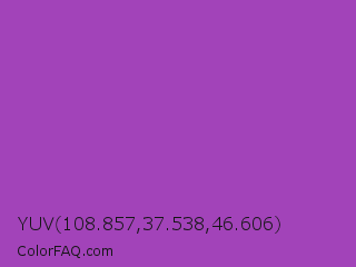 YUV 108.857,37.538,46.606 Color is a normal purple color and the nearest color is Purple Plum #9c51b6. Hex code #a243b9 and RGB value is rgb(162,67,185). In RGB color space, this color is composed of 64% red, 26% green, 73% blue, In CMYK color space, this color is composed of 12% cyan, 64% magenta, 0% yellow , 27% black , In HSL color space, this color has a hue angle of 288° , 47% saturation and 49% lightness.