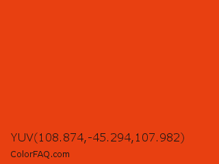 YUV 108.874,-45.294,107.982 Color is a normal red color and the nearest color is Trinidad #e64e03. Hex code #e84011 and RGB value is rgb(232,64,17). In RGB color space, this color is composed of 91% red, 25% green, 7% blue, In CMYK color space, this color is composed of 0% cyan, 72% magenta, 93% yellow , 9% black , In HSL color space, this color has a hue angle of 13° , 86% saturation and 49% lightness.