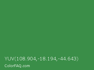 YUV 108.904,-18.194,-44.643 Color is a normal green color and the nearest color is Sea Green #2e8b57. Hex code #3a8e48 and RGB value is rgb(58,142,72). In RGB color space, this color is composed of 23% red, 56% green, 28% blue, In CMYK color space, this color is composed of 59% cyan, 0% magenta, 49% yellow , 44% black , In HSL color space, this color has a hue angle of 130° , 42% saturation and 39% lightness.