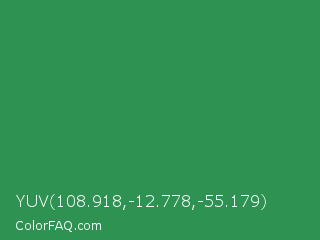 YUV 108.918,-12.778,-55.179 Color is a normal green color and the nearest color is Sea Green #2e8b57. Hex code #2e9253 and RGB value is rgb(46,146,83). In RGB color space, this color is composed of 18% red, 57% green, 33% blue, In CMYK color space, this color is composed of 68% cyan, 0% magenta, 43% yellow , 43% black , In HSL color space, this color has a hue angle of 142° , 52% saturation and 38% lightness.