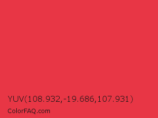 YUV 108.932,-19.686,107.931 Color is a normal red color and the nearest color is Desire #ea3c53. Hex code #e83645 and RGB value is rgb(232,54,69). In RGB color space, this color is composed of 91% red, 21% green, 27% blue, In CMYK color space, this color is composed of 0% cyan, 77% magenta, 70% yellow , 9% black , In HSL color space, this color has a hue angle of 355° , 79% saturation and 56% lightness.