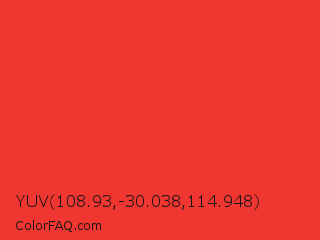 YUV 108.93,-30.038,114.948 Color is a normal red color and the nearest color is Deep Carmine Pink #ef3038. Hex code #f03630 and RGB value is rgb(240,54,48). In RGB color space, this color is composed of 94% red, 21% green, 19% blue, In CMYK color space, this color is composed of 0% cyan, 78% magenta, 80% yellow , 6% black , In HSL color space, this color has a hue angle of 2° , 86% saturation and 56% lightness.