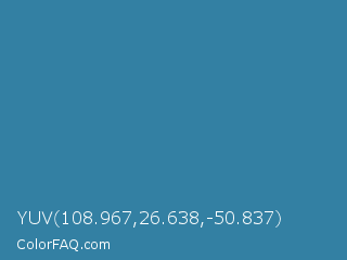 YUV 108.967,26.638,-50.837 Color is a normal blue color and the nearest color is Astral #327da0. Hex code #3380a3 and RGB value is rgb(51,128,163). In RGB color space, this color is composed of 20% red, 50% green, 64% blue, In CMYK color space, this color is composed of 69% cyan, 21% magenta, 0% yellow , 36% black , In HSL color space, this color has a hue angle of 199° , 52% saturation and 42% lightness.