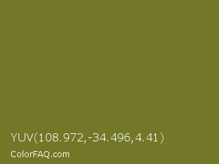 YUV 108.972,-34.496,4.41 Color is a normal yellow color and the nearest color is Crete #737829. Hex code #727827 and RGB value is rgb(114,120,39). In RGB color space, this color is composed of 45% red, 47% green, 15% blue, In CMYK color space, this color is composed of 5% cyan, 0% magenta, 68% yellow , 53% black , In HSL color space, this color has a hue angle of 64° , 51% saturation and 31% lightness.