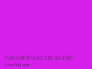 YUV 108.973,62.131,92.109 Color is a normal magenta color and the nearest color is Vivid Mulberry #b80ce3. Hex code #d61feb and RGB value is rgb(214,31,235). In RGB color space, this color is composed of 84% red, 12% green, 92% blue, In CMYK color space, this color is composed of 9% cyan, 87% magenta, 0% yellow , 8% black , In HSL color space, this color has a hue angle of 294° , 84% saturation and 52% lightness.