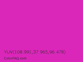 YUV 108.991,37.965,96.478 Color is a normal magenta color and the nearest color is Steel Pink #cc33cc. Hex code #db26ba and RGB value is rgb(219,38,186). In RGB color space, this color is composed of 86% red, 15% green, 73% blue, In CMYK color space, this color is composed of 0% cyan, 83% magenta, 15% yellow , 14% black , In HSL color space, this color has a hue angle of 311° , 72% saturation and 50% lightness.