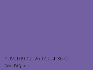 YUV 109.02,26.612,4.367 Color is a normal indigo color and the nearest color is Deluge #7563a8. Hex code #7260a3 and RGB value is rgb(114,96,163). In RGB color space, this color is composed of 45% red, 38% green, 64% blue, In CMYK color space, this color is composed of 30% cyan, 41% magenta, 0% yellow , 36% black , In HSL color space, this color has a hue angle of 256° , 27% saturation and 51% lightness.