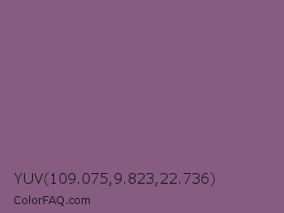 YUV 109.075,9.823,22.736 Color is a normal magenta color and the nearest color is Chinese Violet #856088. Hex code #875c81 and RGB value is rgb(135,92,129). In RGB color space, this color is composed of 53% red, 36% green, 51% blue, In CMYK color space, this color is composed of 0% cyan, 32% magenta, 4% yellow , 47% black , In HSL color space, this color has a hue angle of 308° , 19% saturation and 45% lightness.