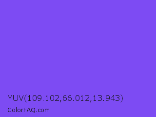 YUV 109.102,66.012,13.943 Color is a light indigo color and the nearest color is Navy Purple #9457eb. Hex code #7d4bf3 and RGB value is rgb(125,75,243). In RGB color space, this color is composed of 49% red, 29% green, 95% blue, In CMYK color space, this color is composed of 49% cyan, 69% magenta, 0% yellow , 5% black , In HSL color space, this color has a hue angle of 258° , 88% saturation and 62% lightness.