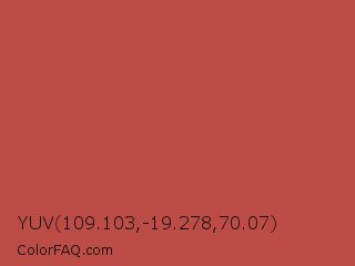 YUV 109.103,-19.278,70.07 Color is a normal red color and the nearest color is Deep Chestnut #b94e48. Hex code #bd4c46 and RGB value is rgb(189,76,70). In RGB color space, this color is composed of 74% red, 30% green, 27% blue, In CMYK color space, this color is composed of 0% cyan, 60% magenta, 63% yellow , 26% black , In HSL color space, this color has a hue angle of 3° , 47% saturation and 51% lightness.