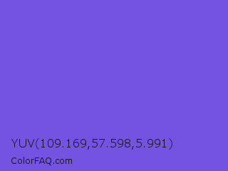 YUV 109.169,57.598,5.991 Color is a light indigo color and the nearest color is Majorelle Blue #6050dc. Hex code #7453e2 and RGB value is rgb(116,83,226). In RGB color space, this color is composed of 45% red, 33% green, 89% blue, In CMYK color space, this color is composed of 49% cyan, 63% magenta, 0% yellow , 11% black , In HSL color space, this color has a hue angle of 254° , 71% saturation and 61% lightness.
