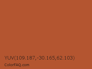 YUV 109.187,-30.165,62.103 Color is a normal orange color and the nearest color is Tuscany #bd5e2e. Hex code #b45530 and RGB value is rgb(180,85,48). In RGB color space, this color is composed of 71% red, 33% green, 19% blue, In CMYK color space, this color is composed of 0% cyan, 53% magenta, 73% yellow , 29% black , In HSL color space, this color has a hue angle of 17° , 58% saturation and 45% lightness.
