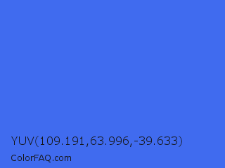 YUV 109.191,63.996,-39.633 Color is a normal blue color and the nearest color is Ultramarine Blue #4166f5. Hex code #406bef and RGB value is rgb(64,107,239). In RGB color space, this color is composed of 25% red, 42% green, 94% blue, In CMYK color space, this color is composed of 73% cyan, 55% magenta, 0% yellow , 6% black , In HSL color space, this color has a hue angle of 225° , 85% saturation and 59% lightness.
