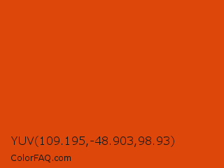 YUV 109.195,-48.903,98.93 Color is a normal orange color and the nearest color is Trinidad #e64e03. Hex code #de470a and RGB value is rgb(222,71,10). In RGB color space, this color is composed of 87% red, 28% green, 4% blue, In CMYK color space, this color is composed of 0% cyan, 68% magenta, 95% yellow , 13% black , In HSL color space, this color has a hue angle of 17° , 91% saturation and 45% lightness.