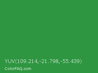YUV 109.214,-21.798,-55.439 Color is a normal green color and the nearest color is Sea Green #2e8b57. Hex code #2e9641 and RGB value is rgb(46,150,65). In RGB color space, this color is composed of 18% red, 59% green, 25% blue, In CMYK color space, this color is composed of 69% cyan, 0% magenta, 57% yellow , 41% black , In HSL color space, this color has a hue angle of 131° , 53% saturation and 38% lightness.