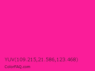 YUV 109.215,21.586,123.468 Color is a normal magenta color and the nearest color is Fluorescent Pink #ff1493. Hex code #fa1d99 and RGB value is rgb(250,29,153). In RGB color space, this color is composed of 98% red, 11% green, 60% blue, In CMYK color space, this color is composed of 0% cyan, 88% magenta, 39% yellow , 2% black , In HSL color space, this color has a hue angle of 326° , 96% saturation and 55% lightness.