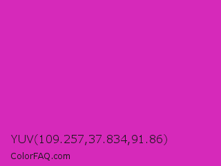 YUV 109.257,37.834,91.86 Color is a normal magenta color and the nearest color is Steel Pink #cc33cc. Hex code #d629ba and RGB value is rgb(214,41,186). In RGB color space, this color is composed of 84% red, 16% green, 73% blue, In CMYK color space, this color is composed of 0% cyan, 81% magenta, 13% yellow , 16% black , In HSL color space, this color has a hue angle of 310° , 68% saturation and 50% lightness.