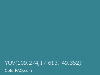 YUV 109.274,17.613,-49.352 Color is a normal cyan color and the nearest color is Astral #327da0. Hex code #358391 and RGB value is rgb(53,131,145). In RGB color space, this color is composed of 21% red, 51% green, 57% blue, In CMYK color space, this color is composed of 63% cyan, 10% magenta, 0% yellow , 43% black , In HSL color space, this color has a hue angle of 189° , 46% saturation and 39% lightness.