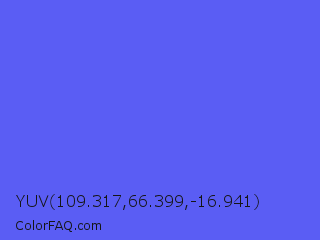 YUV 109.317,66.399,-16.941 Color is a light blue color and the nearest color is Very Light Blue #6666ff. Hex code #5a5df4 and RGB value is rgb(90,93,244). In RGB color space, this color is composed of 35% red, 36% green, 96% blue, In CMYK color space, this color is composed of 63% cyan, 62% magenta, 0% yellow , 4% black , In HSL color space, this color has a hue angle of 239° , 88% saturation and 65% lightness.