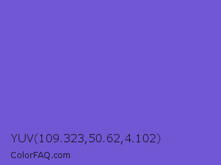 YUV 109.323,50.62,4.102 Color is a normal indigo color and the nearest color is Slate Blue #6a5acd. Hex code #7257d4 and RGB value is rgb(114,87,212). In RGB color space, this color is composed of 45% red, 34% green, 83% blue, In CMYK color space, this color is composed of 46% cyan, 59% magenta, 0% yellow , 17% black , In HSL color space, this color has a hue angle of 253° , 59% saturation and 59% lightness.