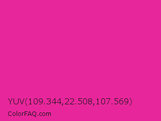 YUV 109.344,22.508,107.569 Color is a normal magenta color and the nearest color is Barbie Pink #e0218a. Hex code #e8269b and RGB value is rgb(232,38,155). In RGB color space, this color is composed of 91% red, 15% green, 61% blue, In CMYK color space, this color is composed of 0% cyan, 84% magenta, 33% yellow , 9% black , In HSL color space, this color has a hue angle of 324° , 81% saturation and 53% lightness.