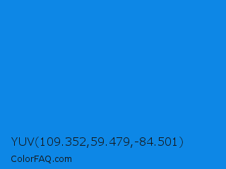 YUV 109.352,59.479,-84.501 Color is a normal blue color and the nearest color is Rich Electric Blue #0892d0. Hex code #0d87e6 and RGB value is rgb(13,135,230). In RGB color space, this color is composed of 5% red, 53% green, 90% blue, In CMYK color space, this color is composed of 94% cyan, 41% magenta, 0% yellow , 10% black , In HSL color space, this color has a hue angle of 206° , 89% saturation and 48% lightness.